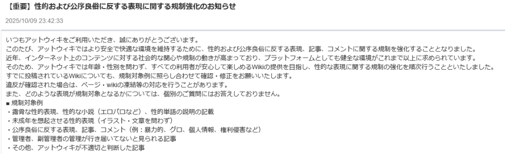 まあ、近年の風当たりが強くなっている感は感じてはきているけど、@wikiも本腰を入れ始めるということだろうか。本気度がどれくらいかはわからんけど。